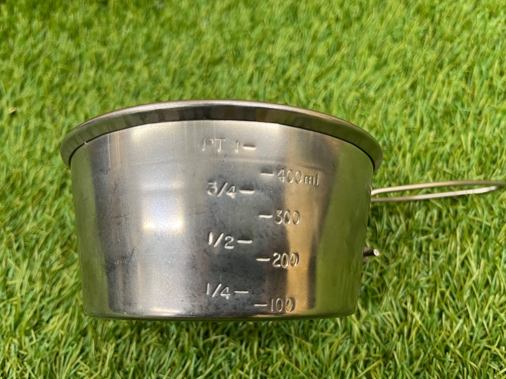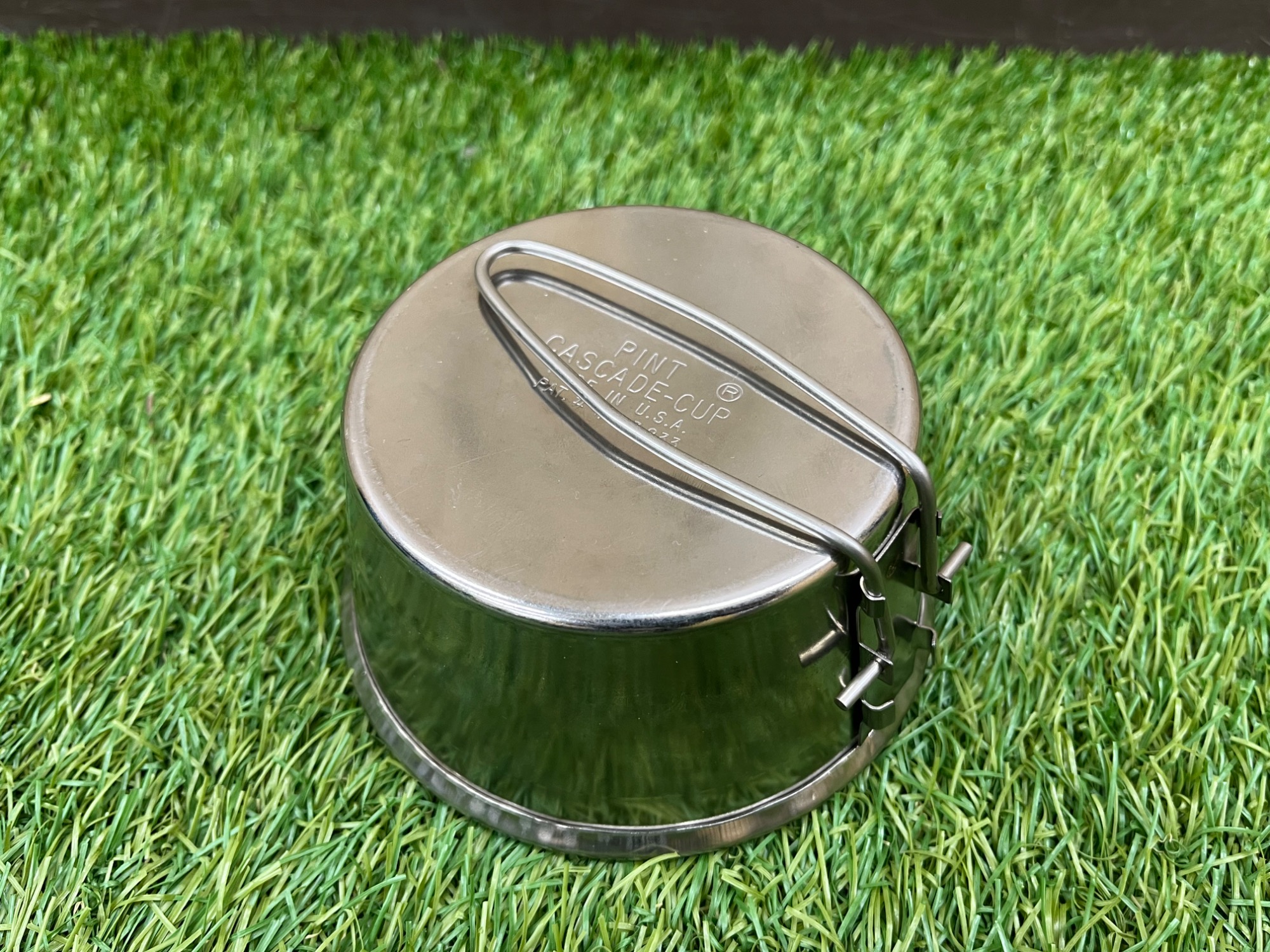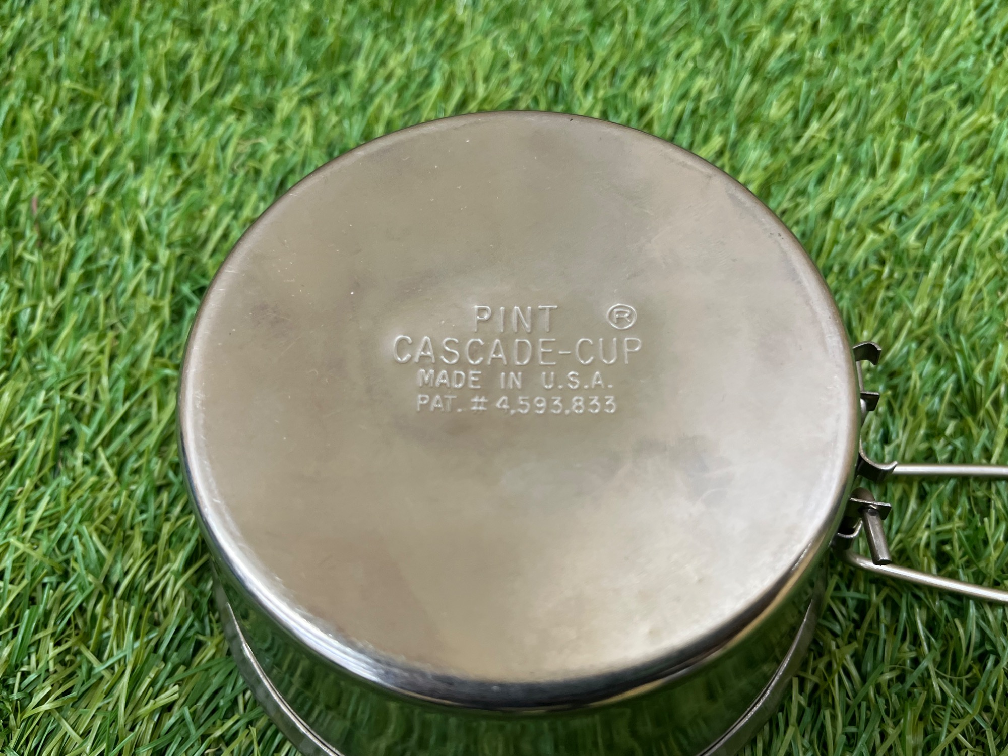 初期型のカスケードカップには本体側面に容量のメモリがPT(パイント)のみで表記されているのですが、こちらは後期型でパイントとmlの両方の刻印がされています。