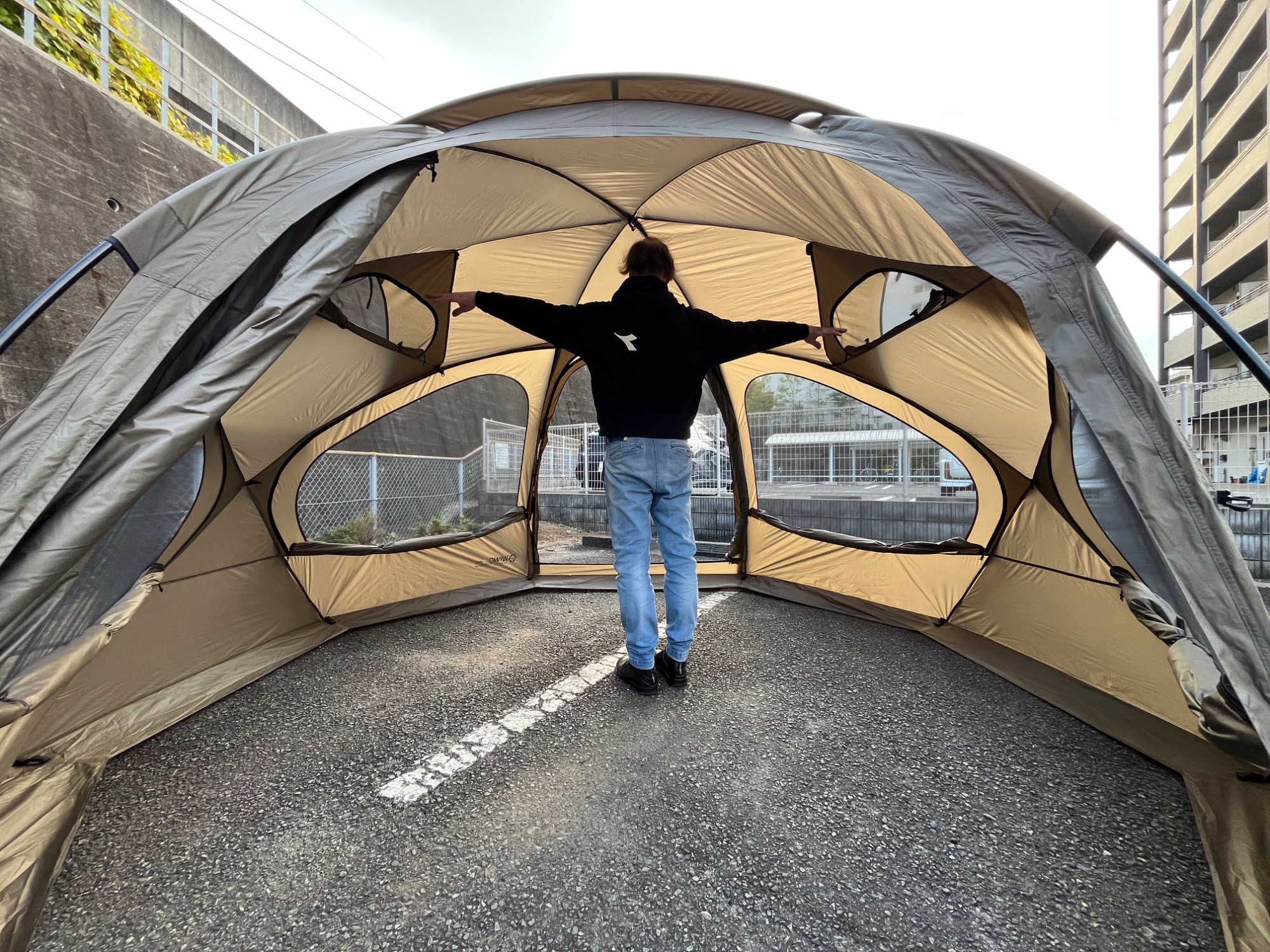 ドーム型シェルターの中ではやや小さめですが、178cmのスタッフが中に入ってもご覧の通り広々しております!