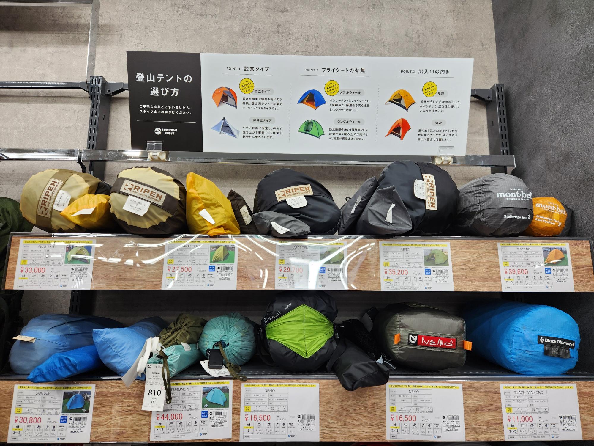 登山用テント以外にもトレッキングウェアやバックパックなどの登山用品も買取・販売中!!