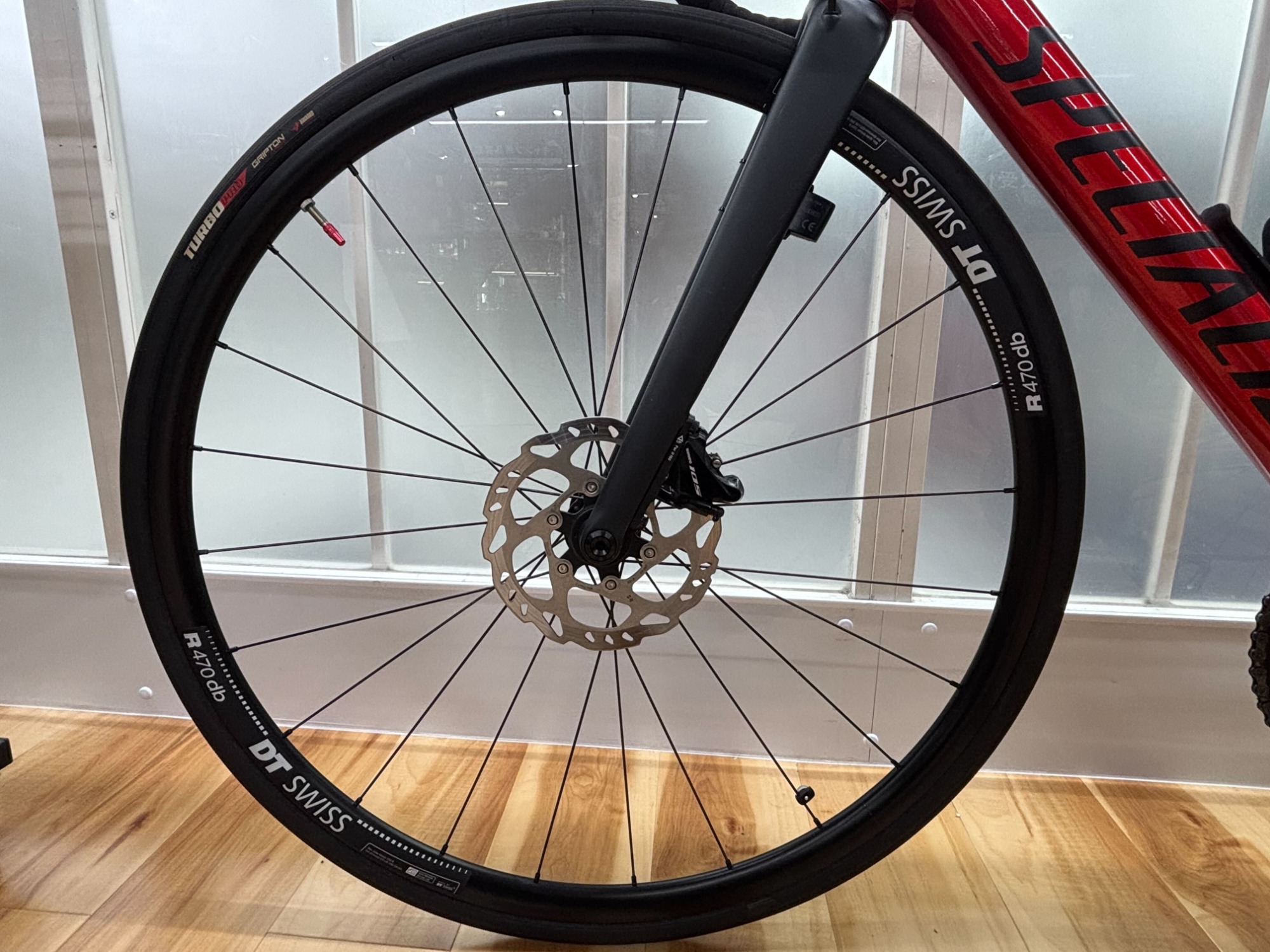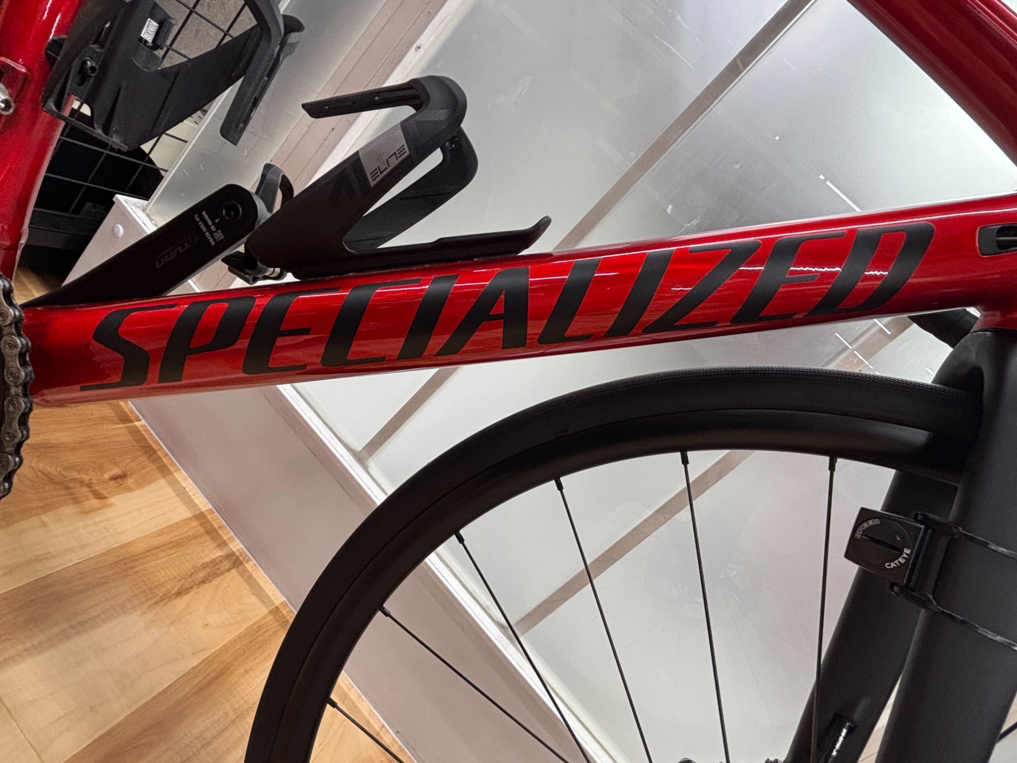 タイヤはスペシャルライズドのTURBO PROが使われておりレース向けのチューブドタイヤになっています。速さ、軽さ、タフさ全てを備えており非常に優秀なタイヤになっています。