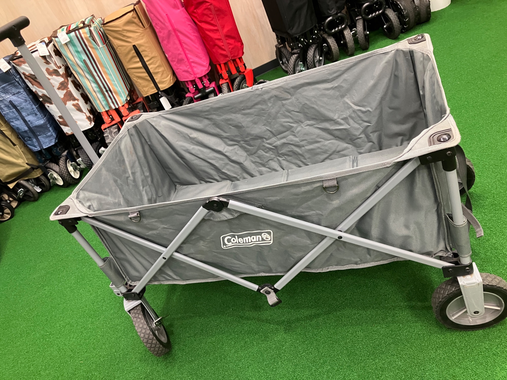 駐車場からサイトまでの荷物運びに重宝し、耐荷重に優れたタフな作りが多くのキャンパーに支持されています。タイヤのすり減り具合やフレームの可動域、ファブリック部分の破れなどがないかを重点的に拝見いたします。