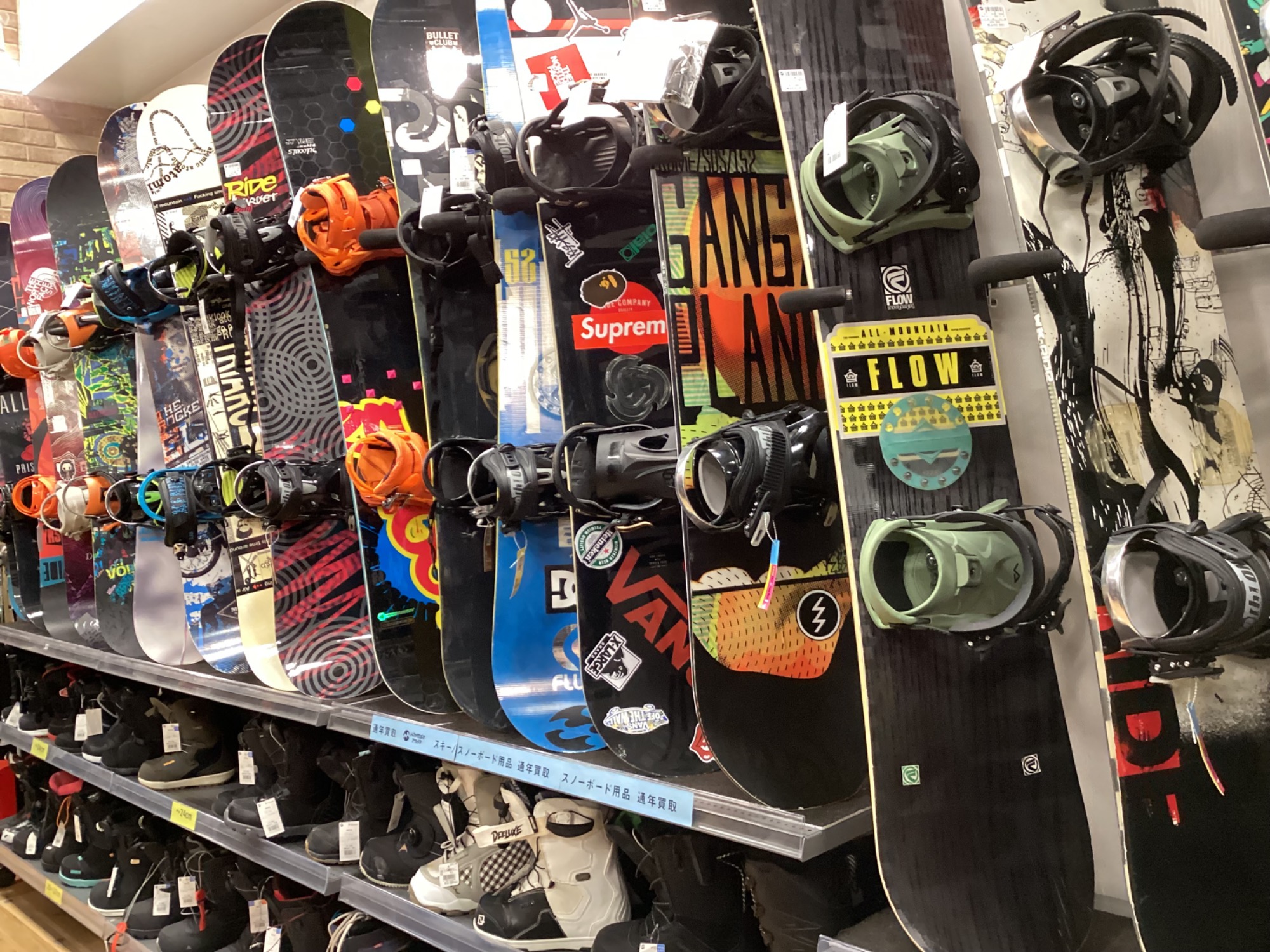 ほかにもたくさんのスノーボードの板やブーツ、ビンディングがございますので