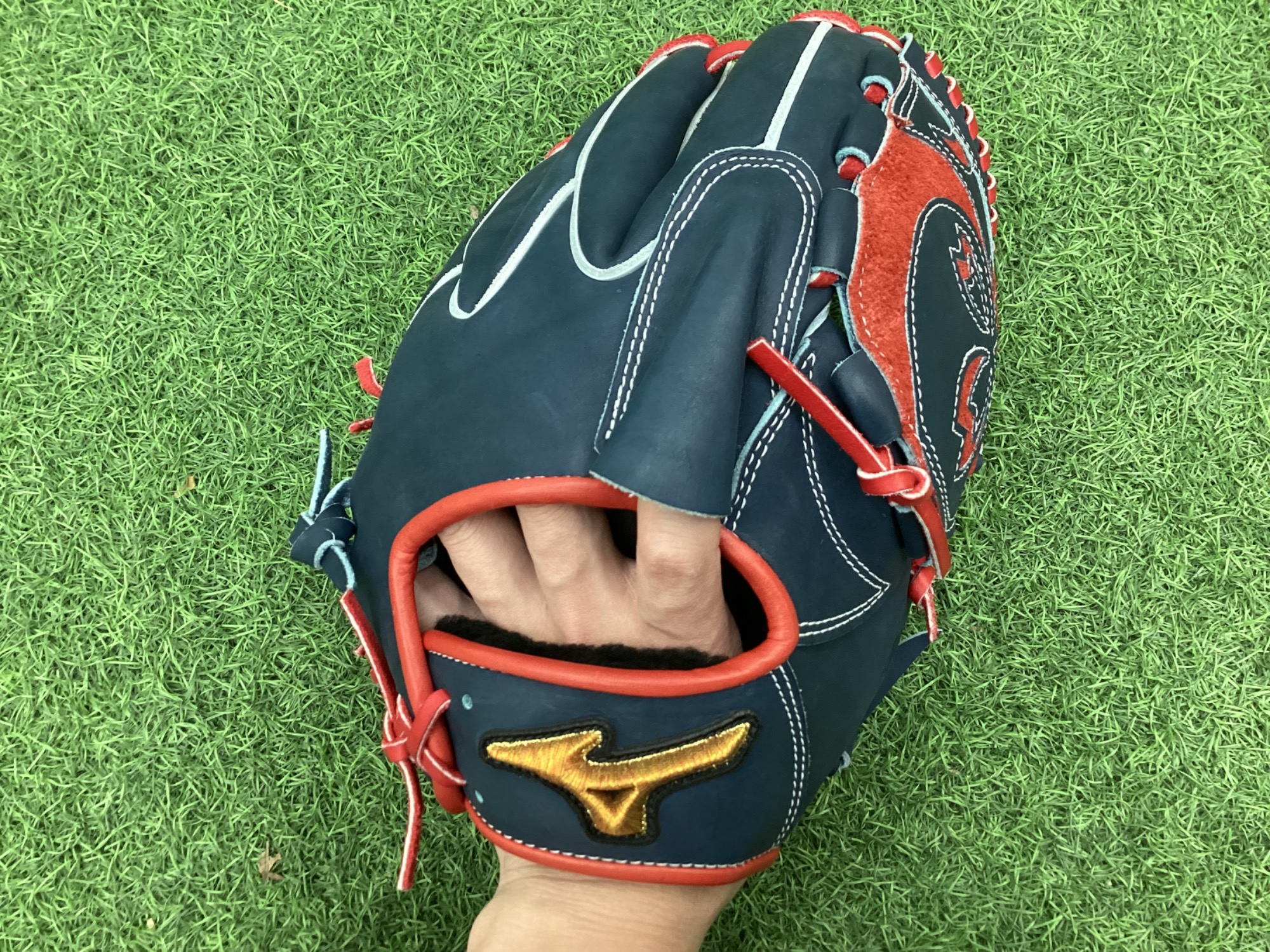 配色が明るめのグラブはオイルを塗ると色落ちしてしまうことがありますが、紺色なら問題なさそうですね。